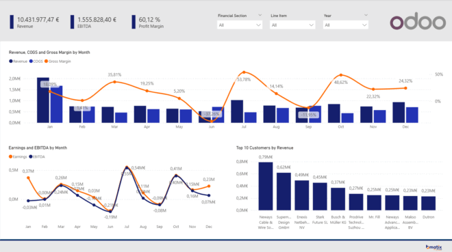 The Go Beyond Odoo Analytics accelerator on Microsoft Fabric gives your company a head start in data-driven decision-making. Instead of building everything from scratch, you get access to a fully integrated data model that aligns with Odoo’s standard structure. Thanks to the integration with Microsoft Fabric, you benefit from scalability, high performance, and all modern tooling needed to adapt our solution to your company’s individual needs. Even our ready-made template dashboards in embedded Microsoft Power BI can be quickly tailored to reflect the narrative of your business and give it your own look an feel.